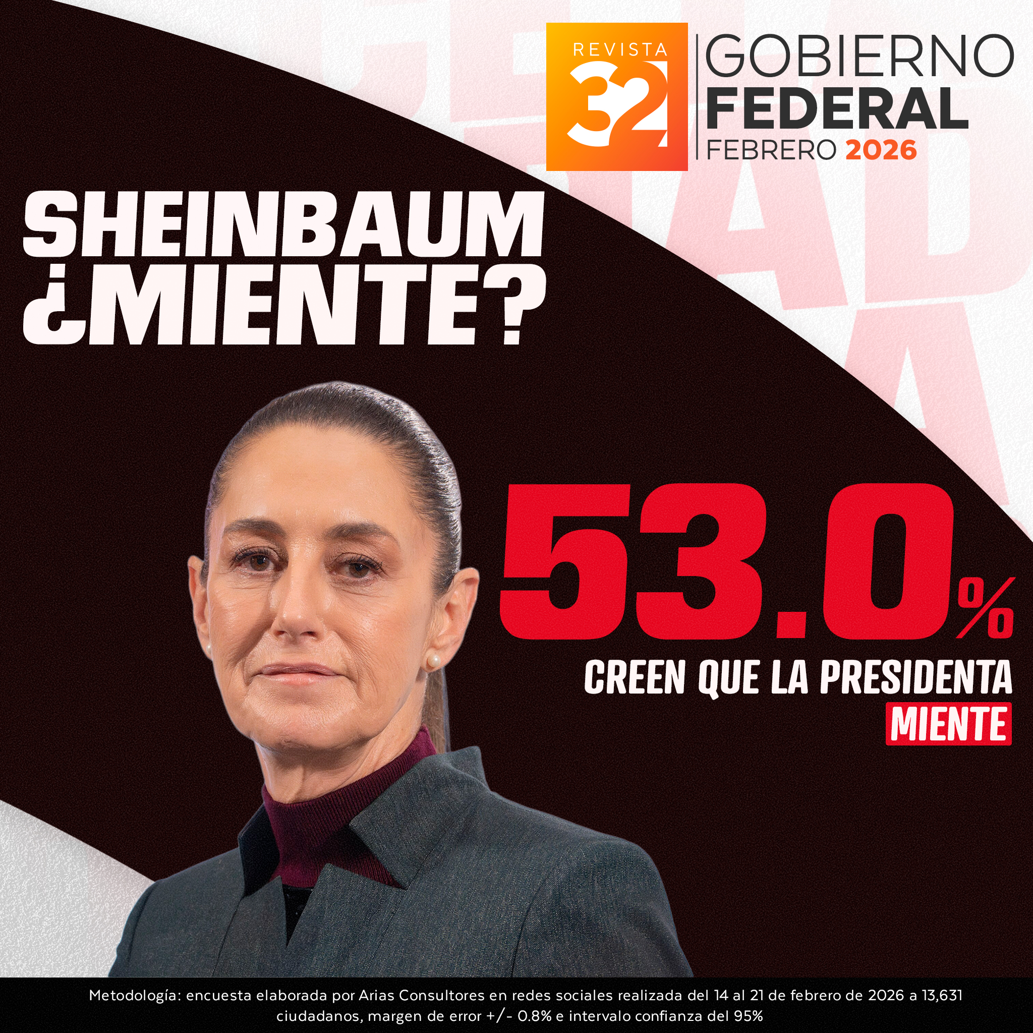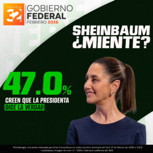 La credibilidad de la presidenta Claudia Sheinbaum Pardo registra un incremento de 3.7% frente a la medición anterior. El 47.0% de los encuestados considera que dice la verdad, mientras que el 53.0% opina que miente. Los mayores niveles de credibilidad se concentran en Tamaulipas y Tlaxcala, con más de 60% de respuestas favorables.