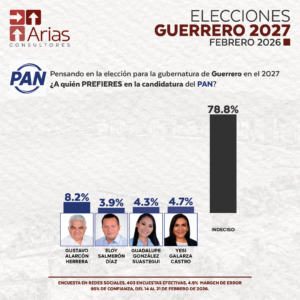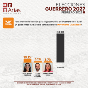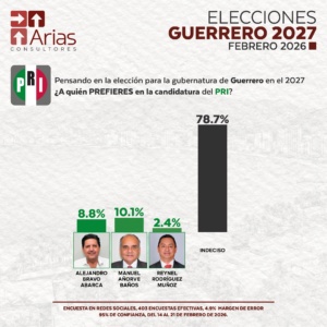 Comienzan a perfilarse distintos nombres en la ruta hacia la elección de la gubernatura de Guerrero en 2027. De acuerdo con el reporte de la encuesta levantada por Arias Consultores del 14 al 21 de febrero de 2026, el nivel de indecisión entre los encuestados aún representa el porcentaje más amplio en la mayoría de los partidos políticos, lo que mantiene abierto el escenario rumbo a la definición de candidaturas.